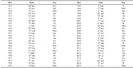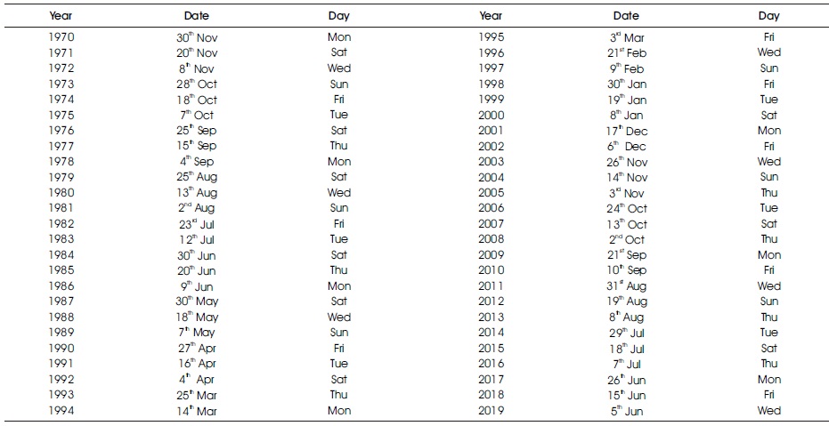 Table 2. The Transition Probability Matrix showing the Changes in Eid al-Fitr Days for the Years from 1970 to 2019