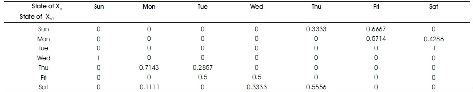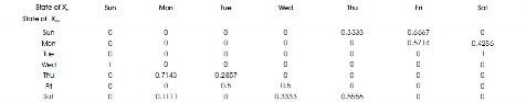 Since the number of state from Sunday to Sunday is 0, and the number of Eid al-Fitr festivals fall on Sundays before 2019 is 6 times, the corresponding transition probability is p1 1 = 0/6 =0. Similarly, we can obtain