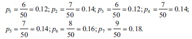 In Table 1, there are Eid al-Fitr days of the last 50 years from 1970 to 2019, where Sunday x1= 6, Monday x2= 7, Tuesday x3 = 6, Wednesday x4= 7, Thursday x5 = 7, Friday x6 = 8, and Saturday x7 = 9 are the states of the Markov chain. Hence the probability of each state is calculated as follows: