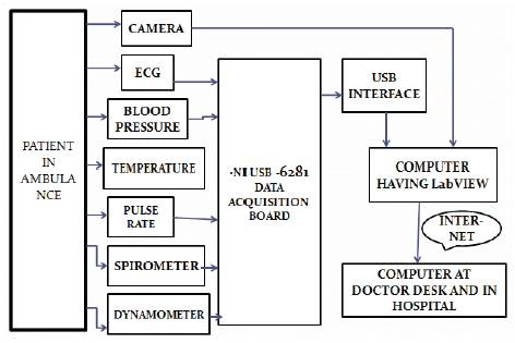 The patient information from the ambulance can be transmitted to hospital using a LabVIEW web Publishing tool. The 3G internet facility can be used for data transfer purpose. LabVIEW has an internet toolkit including the Graphic Web Server, which is used to run applications on the Web. Server and CGI (Computer Generated Imagery) applications intercommunicate through standard inputs and output. The front panel of the VI's (Virtual Instrumentation) will be shared with the doctors.