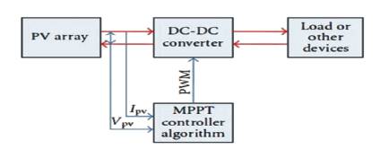 MPPT is a technique to detect the optimum operating point in the photovoltaic system. The system extracts the optimum point from the source when the load resistance becomes equal to the source. There are various algorithms that can track MPP's [6]. Maximum Power Point Tracking for the solar energy is required as the power output of the solar panel varies with the variation temperature and the solar radiation. Figures 3 and 4 show the PV characteristics at constant radiation and constant temperature. The schematic diagram of PV system with MPPT is shown in Figure 5.