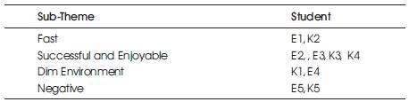 When grouped in the sub-themes of the lesson processing with smart board, it has emerged common statements. These statements has been identified as fast, negative, dim environment, successful and enjoyable. Some examples of the views of students towards the lesson processing with smart boards are given below.