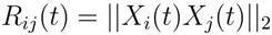 For iteration t, the force acting on mass i from mass j is defined as the following,
