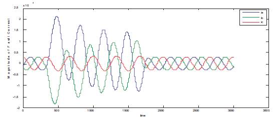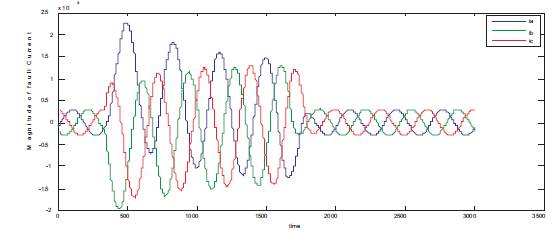 In further stage of the proposed work, the simulation work has been carried for three phase to ground (LLLG) fault both at 25km and 50km respectively. Figure 8 and Figue 9 show the current response for three phases to ground (LLLG) fault for 25km and 50km respectively. From Figure 8 and Figure 9, it is observed that, all the three phase current were distorted and the magnitude of fault current has been furtherly changed when compared with above two cases of current study.