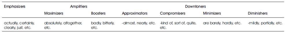 Also, the taxonomy of Quirk, Greenbaum, Leech & Svartvik (1985) was also used to classify the lexical items and phrases under boosters in the model of Hyland & Tse (2004) as presented in Table 3.