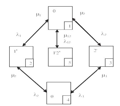 where λ1,λ2 and µ1,µ2 are the failure rates and repair rates of components 1 and 2 respectively. λ12 is the failure rate of both components 1, 2 due to common cause and µ12 is the repair rate of both components simultaneously so that the system can transit from state 4 to state 1 directly.