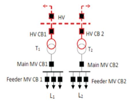 The Load Node scheme is shown in Figure 6. Two fully redundant HV/MV transformer bays feed the two relevant MV bus-bars. The components considered are Circuit Breakers, Transformers, and Feeders. It has to be stated that, the Circuit Breaker duty is to clear faults on other equipment, but itself can be subject to fault. It can also be stated that, there is a possibility of CCF in case of a failure on a transformer, due to the possible overload of the other transformer. It is considered that the failure modes of the first failure and CCF are different. The first failure can be an internal fault, conversely the CCF is due to an overload that can be caused by a design under-sizing. Failure and repair times of Load Node scheme are given in Table 1 [16,17].