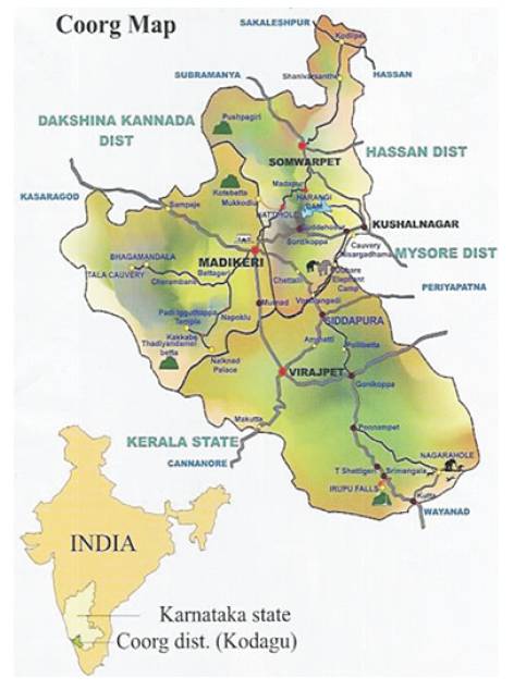 The study area considered for the present work is Kodagu district, as represented by Figure 1, which is also called as Coorg District, situated in the southern part of the Karnataka State. The district is famous as “Kashmir of Karnataka” because of the pleasant weather conditions. The district lies between North latitude 11°56' to 12°56' and east longitude 75°22' to 76°11. Kodagu district covers an area of 4102 Sqkms and the main river of the district is Cauvery, which originates at Talakaveri and is located on the eastern side of the Western Ghats, with its tributaries, draining the greater part of Kodagu. The district is famous for the tropical evergreen forest and is the home for DevaraKadu/Devarabana (SG). Sacred groves exist all over India and in the rest of the world but, the SGs of the Kodagu makes the district unique as this little district has the highest density of SGs with about officially listed 1214 SG. The district has three wildlife sanctuaries: Brahmagiri Wildlife Sanctuary, Talakaveri Wildlife Sanctuary, and Pushpagiri Wildlife Sanctuary, and one National park, nagarahole or Rajiv Gandhi National Park.