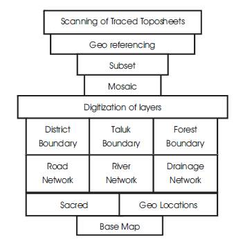 For the present work Survey of India, Toposheets of 1:50,000 Scale, GPS data, Ground truth data, information from localities and from various departments have been collected and captured, stored, managed, analysed and visualised by using softwares such as Erdas imagine 9.1,ArcGIS 10.2, Garmin Mapsource, Open Geosuite 3.0.2