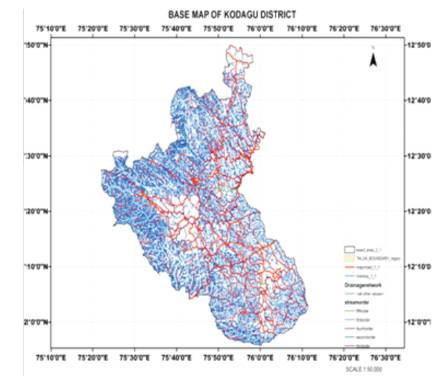 Figure 3. Digitized boundaries of District and Taluk, major roads, reserved Forest boundary, Drainage network and Base Map of Kodagu District.