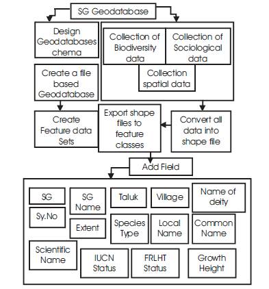 The Methodology adopted to build a SG Geodatabase is as follows. Spatial data as well as all the related Biodiversity data and Sociological data of SGs have been collected from the field. These data has been converted into shapefiles of Geographic WGS 1984 projection. Then schema for SG Geodatabase has been prepared and according to the schema, file based Geodatabase has been created. This Geodatabase contains different Feature data sets to which after reprojecting shape files to UTM WGS 43N projection, they were brought into Feature datasets as Feature classes. These feature classes store all spatial data and non spatial data such as Location details, jurisdictional details, sociological details and biodiversity related details in the form different attribute fields. Methodology for Geo database development is represented in Figure 4.