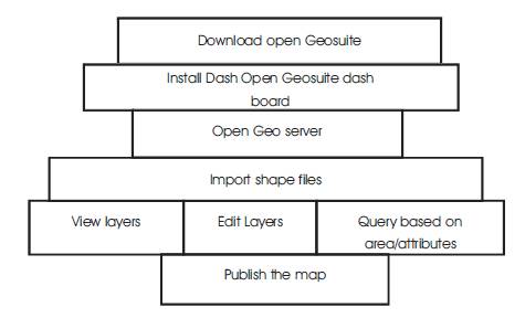 Open Geosuite application is an open source software which can be freely downloaded from http://boundlessgeo.com/solutions/opengeo-suite; which consits of open Geosuite dash board, which is a single interface that allows to access all components of Open Geo Suite, including links to common tasks, configuration, and management. It runs as web application in the same container as GeoServer, accessible at http://localhost: 8080/dashboard. There are load layers i.e, shape files and one can edit the properties and compose and publish web map. Figure 5 represents the Methodology adopted for Open Geosuite applications.
