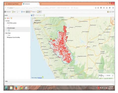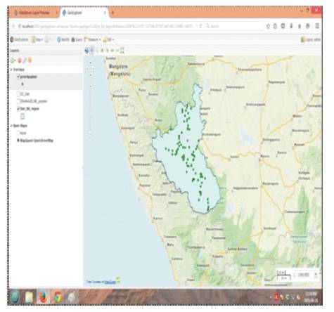 After developing SG Geodatabase, the work aimed at bringing all these data into a system which aids in the dissemination of data through which the biodiversity value SGs hold will be spread and, based on the species availability and threat they face, prioritization for conservation can also be done which is very much needed for conservation action. The Open Geosuite Software was utilized for this purpose. Published data through Open Geo suite will not be helpful for visualization, however, queries can be made based on the location or based on the attributes. Figure 6 shows the Dash board of Open Geosuite, Figure 7 shows the Road network of the district in Geo explorer, Figure 8 shows the Sacred Groves and Figure 9 shows the Query based on Location done by Using Open Geo Explorer.