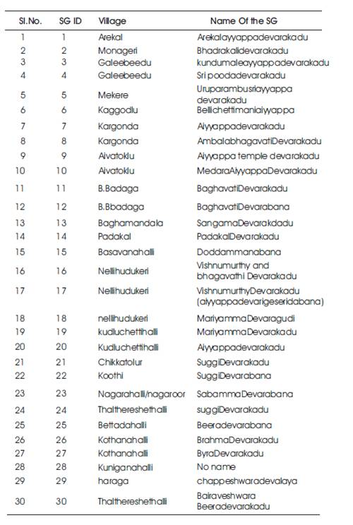 The present work is carried out aiming to prepare Geodatabase for SGs which are shown in Table 1. Totally 851 flora and fauna were observed/found during the field visit. Out of 851 of the total flora and fauna, 91 varieties of Tree species, 59 varieties of Medicinal plant species, 16 animals and 26 birds species have been recorded. All the attribute data has been brought into Arc GIS Environment and summarised to get the reports from which it was found that SGs are treasure houses of Medicinal plants and Traded Medicinal Plants. It was also found that critically endangered species and vulnerable species were preserved in SGs. The list of Scientific Names of the Species is given and Table 2 shows the conservation status of the identified species.