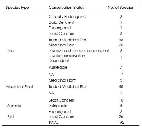 Each SG comprises species data along with their scientific names, growth height, threats and conservation status as provided by International Union of Conservation of Nature (IUCN) and Environmental Information System (ENVIS) - Foundation for Revitalisation of Local Health Traditions (FRLHT Database).For the Present work, conservation status of species is determined by using the IUCN Red List Categories and Criteria because, though there are several methods of determining species status, IUCN is commonly used tool, which allows consistency in approach across different taxonomic groups. It helps in determining the relative risk of extinction and provides the basis for understanding if a species is Extinct, threatened (Critically Endangered, Endangered or Vulnerable), Near Threatened, Least Concern, or lacking sufficient basic data for assessment (Data Deficient) [16].