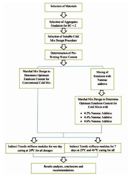 In the present study, dense graded bituminous concrete grade – 2 cold mixes were prepared to check the physical characteristics. Selection of aggregate gradation is as per MORT&H (2013) specification for BC – 2 and selection of emulsion is as per IS: 8887 for the dense graded mixes. The selection of the mix design procedure is as per Asphalt Institute manual series – 14 (1997) and specifications as per the MORT&H (2013). The mixes were added with cement to check the improvement in the mix properties and NanoTac (A product of M/s Zydex) was added in the dosage of 0.2, 0.4, and 0.6 to check the suitability of the product in the reduction of emulsion content, improvements in the mix properties and reduction in the curing time. The indirect tensile stiffness was tested at two curing conditions. In the first type, the specimens were extruded from the mould immediately after compaction and cured for 24 hours at 20 oC and another set of samples were cured for 7 days at 25 oC and 40 oC and tested for dry indirect stiffness modulus and soaked indirect stiffness modulus after one day soaking at 25 oC. The overall methodology is represented in Figure 1.