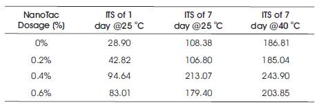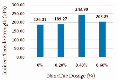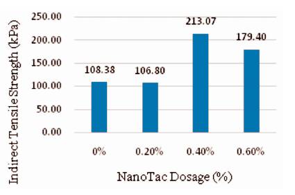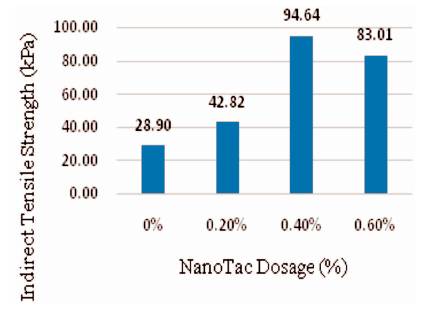 Figure 12. Relationship between Indirect Tensile Strength and different dosage of NanoTac Additive cured for 7 Days at 25 oC