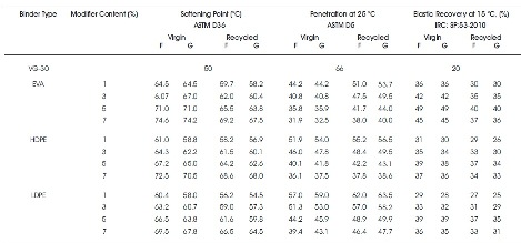 Table 1 shows the results of whole characterization tests that took place for modification of binders with various virgin and recycled polymers. According to their fundamental properties (penetration value and softening point) and resilience based on the specified limitation in Indian codes, the most appropriate amount of each types of polymers were determined. The physical properties of the pristine binder (bitumen VG-30) used for preparation of all modified binders are also shown. In order to assess the efficiency and influence of the different polymers, particle size and time (for digestion process) is applied in this research.