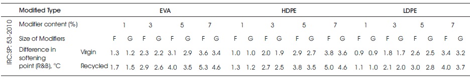 Recycled and virgin EVA, HDPE, and LDPE all in granular and flour form were studied. Comparison of physical characteristics of modified bitumen with 1% - 7% in case of EVAR&V, HDPER&V, and LDPER&V polymers with increment of 2% demonstrated that, the better properties with lower quantity (which satisfied the limit values of Indian standard codes) of the modifier were achieved. In fact, the following conclusions were found.
