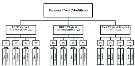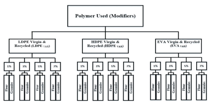 Use of various types of recycled and virgin polymers in granular and flour form in the modification of bitumen was assessed in the current study to evaluate the potential of utilizing recycled one in bituminous mixtures for their valorization.