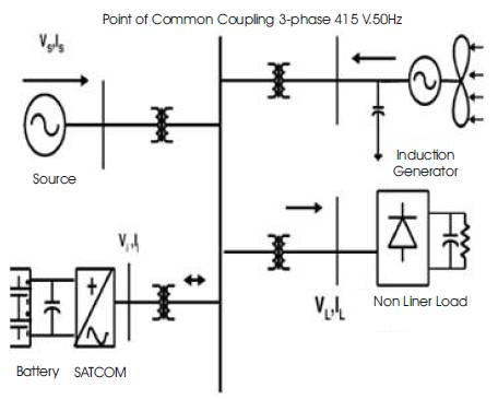 The STATCOM is a three-phase voltage source inverter having the capacitance on its DC link and connected at the point of common coupling. The STATCOM injects a compensating current of variable magnitude and frequency component at the bus of common coupling.