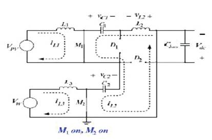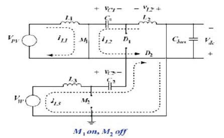 A system diagram of the proposed rectifier stage of a hybrid energy system is shown in Figure 2, where one of the inputs is connected to the output of the PV array and the other input connected to the output of a generator. The fusion of the two converters is achieved by reconfiguring the two existing diodes from each converter and the shared utilization of the Cuk output inductor by the SEPIC converter. This configuration allows each converter to operate normally and individually in the event that one source is unavailable. Figure 3 illustrates the case when only the wind source is available. In this case, D turns off and D 1 2 turns on; the proposed circuit becomes a SEPIC (Single- Ended Primary Inductor Converter) and the input to output voltage relationship is given by equation (1). On the other hand, if only the PV source is available, then D turns off and 2 D will always be on and the circuit becomes a Cuk 1 converter as shown in Figure 4. The input to output voltage relationship is given by equation (2). In both cases, both converters have step-up/down capability, which provide more design flexibility in the system if duty ratio control is utilized to perform MPPT control.
