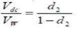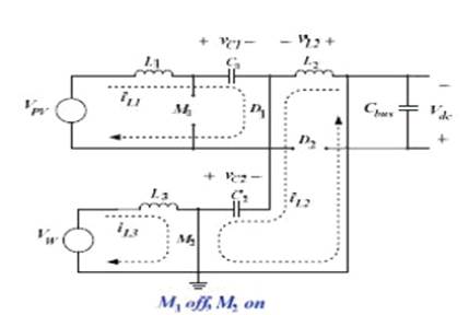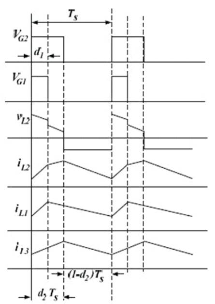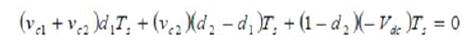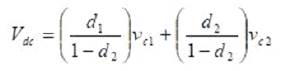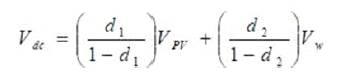 To find an expression for the output DC bus voltage, Vdc , the volt-balance of the output inductor, L2 , is examined according to Figure 6 with d2 > d1 . Since the net change in the voltage of L2 is zero, volt-balance is applied to L2 results in equation (3). The expression that relates the average output DC voltage (Vdc ) to the capacitor voltages (vc1 and vc2 ) is then obtained as shown in equation (4), where vc1 and vc2 can then be obtained by applying volt-balance to L1 and L3[9]. The final expression that relates the average output voltage and the two input sources (Vw and Vpv ) is then given by equation (5). It is observed that, Vdc is simply the sum of the two output voltages of the Cuk and SEPIC converter. This further implies that Vdc can be controlled by d1 and d2 individually or simultaneously.