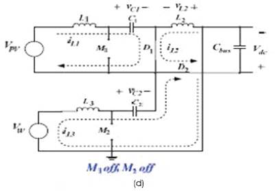 Figure 5 illustrates the various switching states of the proposed converter. If the turn on duration of M is longer 1 than M , then the switching states will be state I, II, V. Similarly, 2 the switching states will be state I, III, IV if the switch conduction periods are vice versa. To provide a better explanation, the inductor current waveforms of each switching state are given as follows, assuming that d2 > d1 ; hence only states I, III, IV are discussed in this example. In the following, Ii, PV is the average input current from the PV source; Ii, W is the RMS input current after the rectifier (wind case); and Idc is the average system output current. The key waveforms that illustrate the switching states in this example are shown in Figure 6. The mathematical expression that relates the total output voltage and the two input sources will be illustrated in the next section.