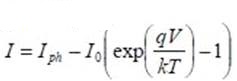 A solar cell is comprised of a P-N junction semiconductor that produces currents via the photovoltaic effect. PV arrays are constructed by placing numerous solar cells connected in series and in parallel[5]. A PV cell is a diode of a large-area forward bias with a high voltage and the equivalent circuit is shown by Figure 9. The current-voltage characteristic of a solar cell is derived as follows: