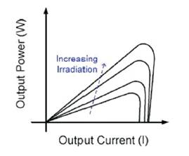 The typical output power characteristics of a PV array under various degrees of irradiation is illustrated by Figure 11. It can be observed in Figure 11 that, there is a particular optimal voltage for each irradiation level that corresponds to maximum output power. Therefore, by adjusting the output current (or voltage) of the PV array, maximum power from the array can be drawn.