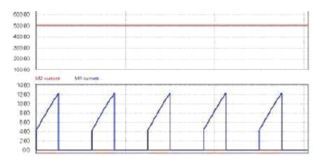 Figure 13. Individual operation with only PV source (Cuk operation) Top: Output power, Bottom: Switch currents (M1 and M2)