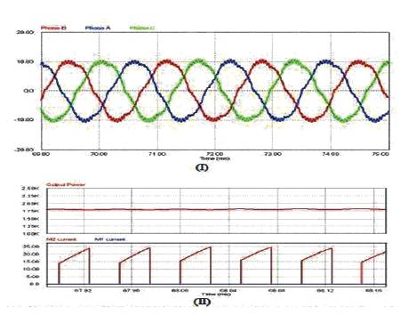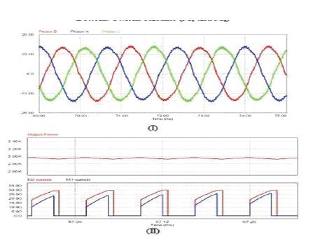 Figure 15. Simultaneous operation with both wind and PV source (Fusion mode with Cuk and SEPIC)(I) The injected three phase generator current, (II) Top: Output power, Bottom: Switch currents (M1 and M2 )