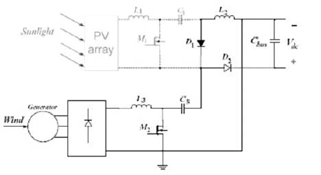 With increasing concern of global warming and the depletion of fossil fuel reserves, many are looking for sustainable energy solutions to preserve the earth for the future generations. Other than hydro power, wind and photovoltaic energy hold the most potential to meet our energy demands. Wind energy alone is capable of supplying large amounts of power, but its presence is highly unpredictable, as it can be here one moment and gone in another. Similarly, solar energy is present throughout the day, but the solar irradiation levels vary due to sun intensity and unpredictable shadows cast by clouds, birds, trees, etc. The common inherent drawback of wind and photovoltaic systems are their intermittent natures that make them unreliable. However, by combining these two intermittent sources and by incorporating Maximum Power Point Tracking (MPPT) algorithms, the system's power transfer efficiency and reliability can be improved significantly. When a source is unavailable or insufficient in meeting the load demands, the other energy source can compensate for the difference. Several hybrid wind/PV power systems with MPPT control have been proposed and discussed in works[1]- [5]. Most of the systems in literature use a separate DC/DC boost converter which is connected in parallel in the rectifier stage as shown in Figure 1 to perform the MPPT control for each of the renewable energy power sources [1]-[4]. A simpler multi-input structure has been suggested by[5] that combines sources from the DC-end, while still achieving MPPT for each renewable source. The structure proposed by[5] is a fusion of the buck and buck-boost converter. The systems in literature require passive input filters to remove the high frequency current harmonics injected into wind turbine generators. The harmonic content in the generator current decreases its lifespan and increases the power loss due to heating.