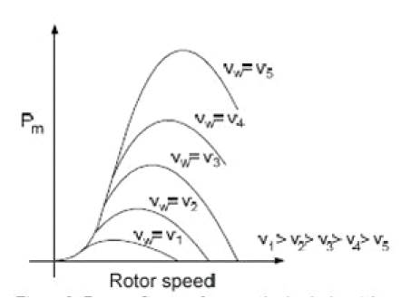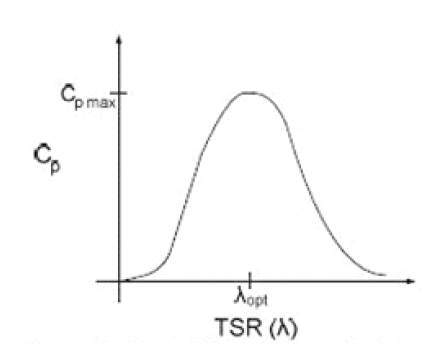 Figures 7 and 8 are illustrations of a power coefficient curve and power curve for a typical fixed pitch (β =0) horizontal axis wind turbine. It can be seen from Figure 7 and 8 that, the power curves for each wind speed have a shape similar to that of the power coefficient curve. Because the TSR is a ratio between the turbine rotational speed and the wind speed, it follows that each wind speed would have a different corresponding optimal rotational speed that gives the optimal TSR. For each turbine, there is an optimal TSR value that corresponds to a maximum value of the power coefficient (Cp , max) and therefore maximum power. Therefore, by controlling rotational speed, (by means of adjusting the electrical loading of the turbine generator) maximum power can be obtained for different wind speeds.