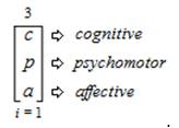 This expression is read and pronounced as follows, “The ambitation of the cognitive learning domain (c) to the psychomotor learning domain (p) to the affective learning domain (a) from an index (i) that equals 1 and is inclusive of all 3 values”.