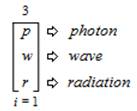 This expression is read and pronounced as follows, “The ambitation of the Trielectric Sub–Trichotomous Charge State of natural phenomena in the form = “Light” as value (l) to the Trielectric Sub-Trichotomous Charge State of natural phenomena in the form = “Flame” as value (f) to the Trielectric Sub-Trichotomous Charge State of natural phenomena in the form = “Electricity”as value (e) from an index (i) that equals 1 and is inclusive of all 3 values”. As a result of the “Light” value threefold within sub-trichotomous states that are formulated as: “photon” as value (p); “wave” as value (w); and “radiation” as value (r). The ambitation of the values is presented as,