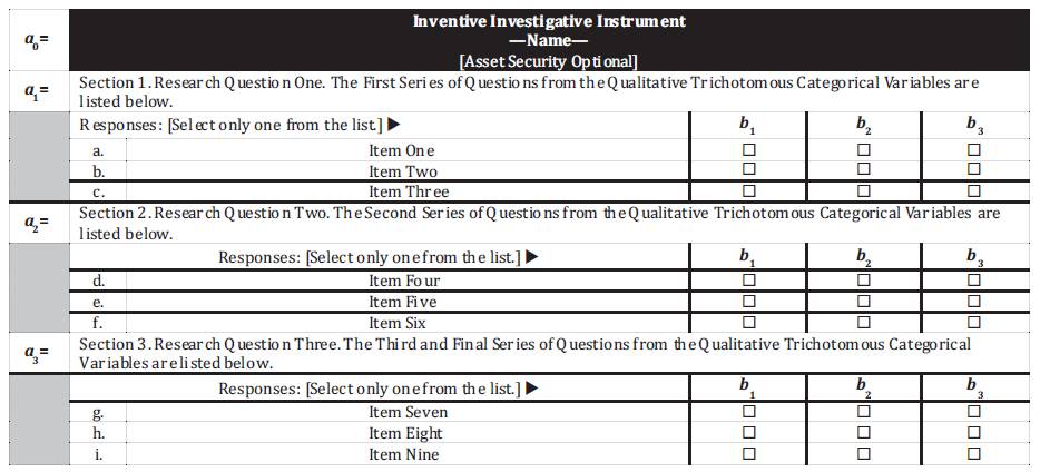 =“The Continuous Connection to Corresponding Sub-Sequential Variables”, this symbolizes the trifold dual nature of the neuro engineering neuro mathematical ambit notation, as it can have two values directly symbolizing the nature of the variables of the Tri–Squared Test 3 × 3 Standard Table or it can symbolize as values or variables [“a”, “b”, and “c”] symbolizing the three initial trichotomous research questions that are presented in the Triple-I research instrument.Note: The expression for (equation 1) literally means, “The ambit of value one as determined by value two with an index of 1 and a neuromand of 3”. It is also important to note that, when there are not three trichotomous values contained within the ambit, where the dual values are at the high and low ends of the ambit is indicative of the highest value determined by lowest value according to a specified criterion (for example an “x” and “y” placement of values representing Cartesian Coordinates, where “x” merits its overall outcome based upon “y”).