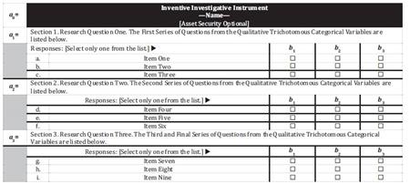 An ideal example of the use of neuroengineering neuromathematics notation can be evidenced in its use to explain and define the systemic procedures used to move from trioinformatic trichotomous logical statements to the Tri–Squared Test 3 × 3 Standard Table. The actual sequential procedures used to move from the trichotomous research questions to the Standard 3 × 3 Table are as follows,