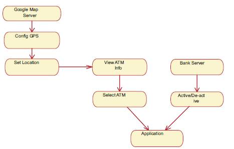 The overall execution of an app can be explained using the architectural design. The Google map server contains preloaded map which can be retrieved by the user. The GPS technology can be used to locate the user’s current location, for which the user's device has to be configured to access the Google map. The location has to be set to find the ATM, then all the nearest ATM locations are displayed from which the user can choose the ATM to check their status condition. This status information can be obtained from the bank which has been preloaded to the bank server automatically by all the nearest ATMs.