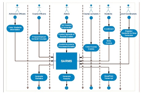 The program design identifies the software modules and their relationships as well as the solution statement and coding. The Top-Down design approach was adopted; a design process that begins the system from the topmost module and broken down into subsystems. Each subsystem is taken in turn and broken down further progressively into a program module to achieve a desired design. Figure 8 represents the activity diagram of the interactions from major users of the system, such as System Admin, Departmental Exams Officers, Level Coordinators, Course Lecturers, Students, and the University Admission Officer.