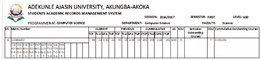The system generates reports that are useful for various units of the universities such as Academic Planning office Dean's office the Business Committee of Senate (BCS), Office of the Registrar and the Students. The broadsheet of result shows per level including the grades, GPAs, all units, and academic status of students in a semester for consideration of approvals; computed summaries of results computed student transcripts for internal uses; provisions of various statistical reports.
