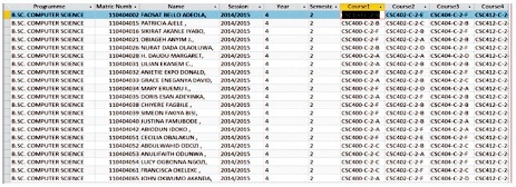In many cases, it is more convenient to generate students' results having course types, course status and course unit information accompanying each course in the output results. This information is essential for users to determine as quickly as possible, if a student has met certain criteria for a particular situation, for example, to graduate students from the university. However, for university-wide results processing management of courses and their attributes in several programmes course status, types, units, etc., becomes complex. The reason is that if several students from different academic programmes and departments register for a common course, such a course may have different attributes to different programmes. For instance, while such course is "compulsory" and local to students in one department, it may be an "elective" and foreign course with different course units to students in other departments. This again includes time line by session to allow correctness of computed results over successive sessions. Figure 6 shows the table for all courses that address the problems. Based on supplied information of courses supplied for each programme, our approach attached information about a course to the course codes according to the properties of the course in an academic programme. Detail course information is included in the course sheets for spreadsheets and individual transcript results to reduce time spent on verification of results.