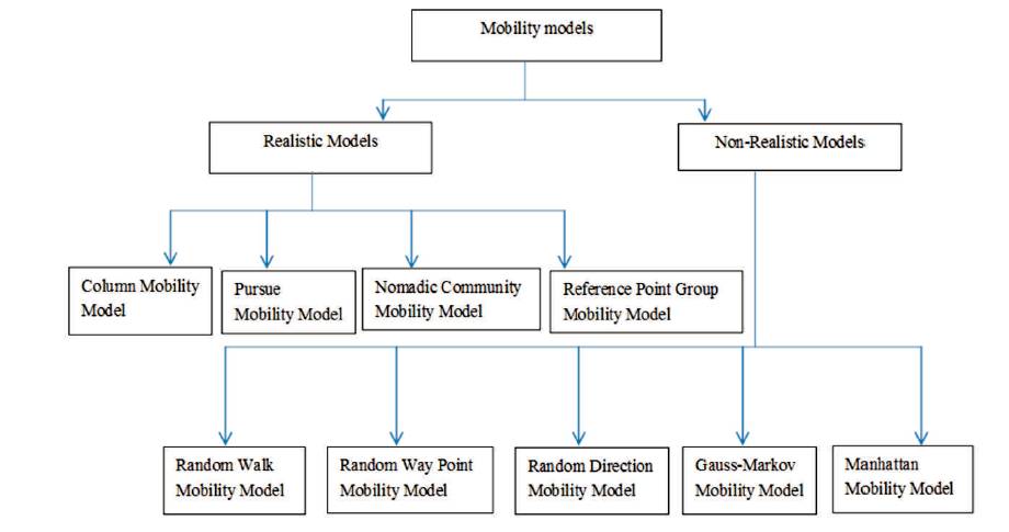 A mobility model attempts to mimic the movement of real mobile nodes that change the velocity and direction with time. Mobility model represents the nodes' displacement and position. It also signifies the movement of nodes and their location, velocity and acceleration change over time. Such models are frequently used for simulation purposes, when new communication or navigation techniques are investigated. Mobility management schemes for mobile communication systems make use of mobility models for predicting future node positions (Jain et al., 2015). Israni et al., (2015) presented the classification of mobility models used in Mobile Ad Hoc Network (MANET). It is classified into two types, one is Realistic model and another one is Non-realistic model. Classification of mobility models are shown in Figure 1.