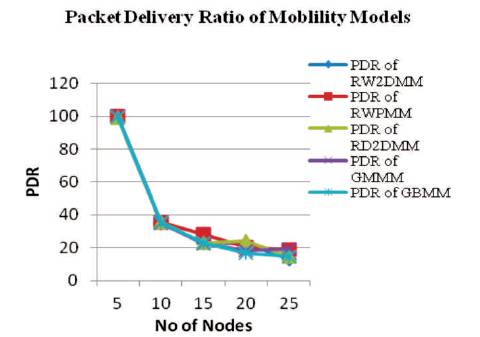 Figure 2 shows the variation of PDR with varying number of nodes. The graph shows that at 15 no. of nodes, Random Way point gives better Packet Delivery Ratio (PDR) compared to other Mobility Models.