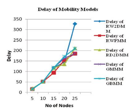 Figure 3 shows the variation of delay with varying number of nodes. The graph shows that at 15 no. of nodes, Random Way point gives less delay compared to other Mobility Models.