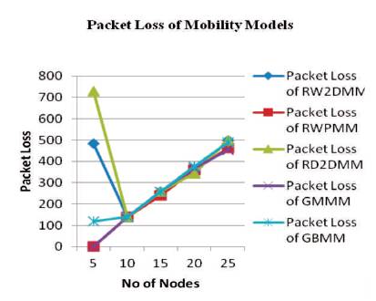 Figure 4 shows the variation of packet loss with varying number of nodes. The graph shows that at 15 no. of nodes, Random Way point gives less number of packet loss compared to other Mobility Models.