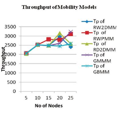 Figure 5 shows the variation of throughput with varying number of nodes. The graph shows that at 15 no. of nodes, Random Way point gives better throughput compared to other Mobility Models