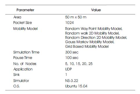 In this experiment, 5, 10, 15, 20, 25 number of nodes with different mobility models are simulated and the performance metrics PDR, throughput, delay, packet loss etc. are measured. Node pause time was also considered. For this simulation in NS-3.22, the parameters used are shown in Table 1.