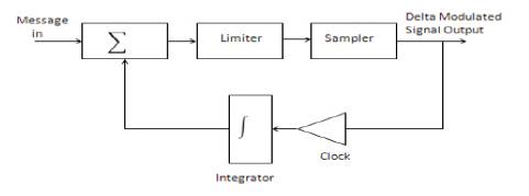 The system is a continuous time to discrete time converter. In fact, it is a form of analog to digital converter, and is the starting point from which more sophisticated delta modulators can be developed [15]. The sampler block is clocked. This is the delta modulated signal, the waveform of which is shown in Figure 2. It is fed back, in a feedback loop, via an integrator, to a summer.