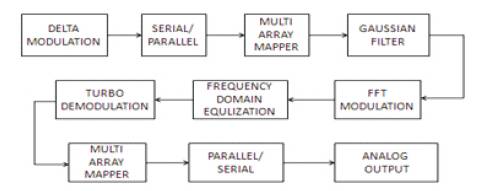The proposed system using turbo algorithm is to optimize the performance in the receiver. In future, the simulation model designed for the delta modulation system is utilized for the hardware implementation. It is hoped that the proposed delta modulation using turbo algorithm provides more reliability and also increase the data rate in mobile communication.